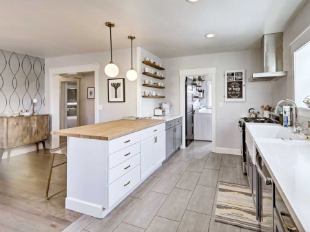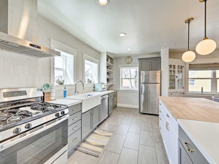 When it's snack time, follow the hardwood floors into the fully equipped kitchen boasting new stainless steel appliances, an Aliante backsplash from TileBar NYC, a farm-style apron sink, and Caesar stone butcher block countertops. Mid-century modern lighting highlights the space making every cooking experience a luxurious one.