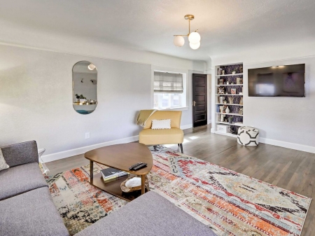 Original built-ins and Roman style privacy shades complete the modern-styled living room. Have a seat on the couch to search for a new movie to watch on the flat-screen Smart TV equipped with Roku and a complimentary Netflix account.