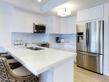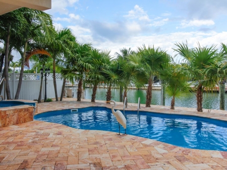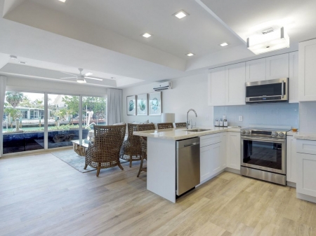 The kitchen has all the necessary cooking accessories for a meal prepared in the kitchen, plus group seating at the breakfast bar and a nearby table with seating for four. Dine al fresco on the patio, where you can also enjoy the swimming pool or walk down to the waterfront for canal access.
