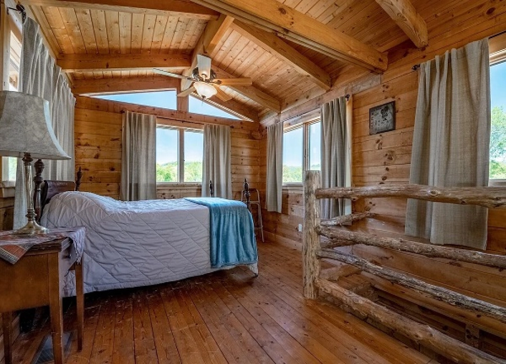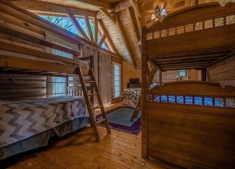 Upstairs there are 2 huge master bedrooms that each have king beds, sitting areas, bathrooms with jacuzzi tubs, and walkout balcony decks with gorgeous views. There is also the bunk room with 2 sets of bunk beds and also a loft area with a very comfy futon and Thomas the Tank Engine track set for the younger train enthusiasts. At the top is the tower bedroom which has incredible views in all directions and has a full bed in it.